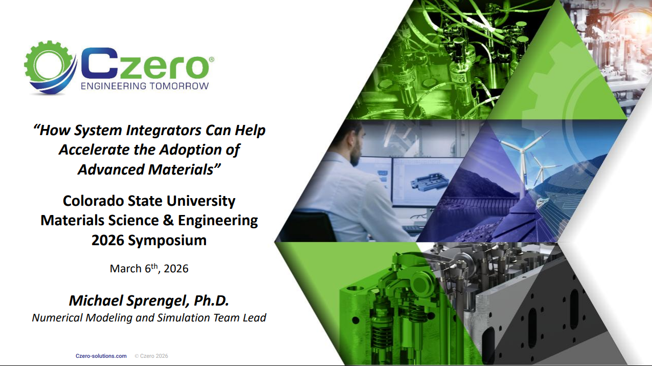 Dr. Michael Sprengel, Czero’s Numerical Modeling and Simulation Team Lead, presented at the Colorado State University Materials Science & Engineering 2026 Symposium on March 6, 2026. His talk, “How System Integrators Can Help Accelerate the Adoption of Advanced Materials,” explored the critical role system integrators play in bridging the gap between emerging materials research and real-world deployment. The event provided a valuable opportunity to share insights and connect with the next generation of materials and engineering innovators. Download the slides here.